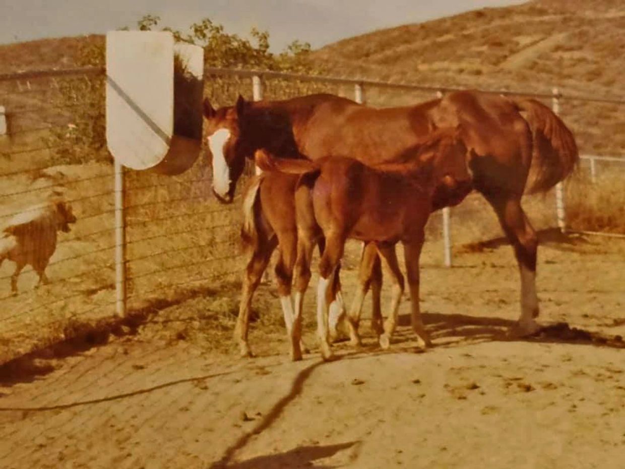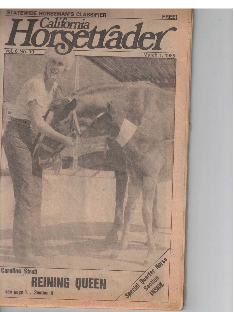 The gorgeous paint baby was sold early on, but Surprise was tiny and needed the time to grow and fill out. When she was a two year old we bred her to Peppy Chex Doc and she had a filly who seemed almost as big as her Mom. Surprise lost all her colostrum so we took a unit of blood from another mare and gave the plasma to Surprise's baby. See the cover photo below in March 1st. 1985 California Horsetrader. The filly never looked back from that plasma transfusion and Surprise matured physically a great deal. She was eventually sold to a man who said "she is the best horse I've ever owned". What a wonderful life experience! In this old photo above Surprise is on the left and Color me Sneaky is the larger foal on the right.