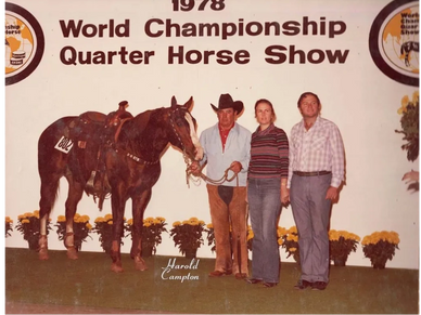 We bought Pete as a very promising athletic two year stallion. He won every western pleasure futurity and class he was entered in as a two and three year old, and also halter classes. He severed a tendon on a trailer light guard and had to be on complete stall rest, but in time he recovered and eventually got back into training. After such a severe injury he was able to enter in reining and working cowhorse classes. He won AQHA reining, western pleasure, halter, working cowhorse classes. In 1978 he was the AQHA Reserve World Champion Working Cowhorse.