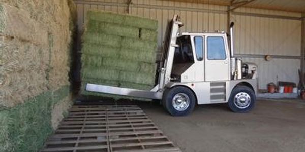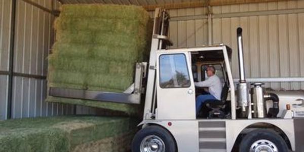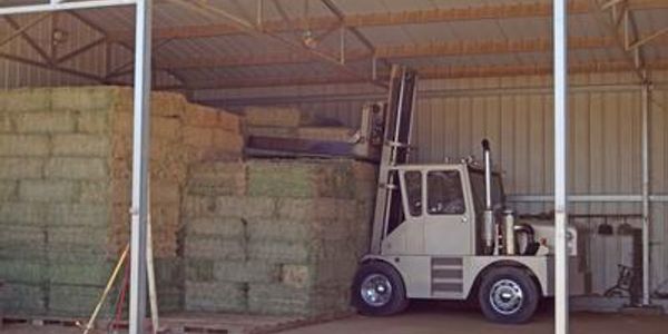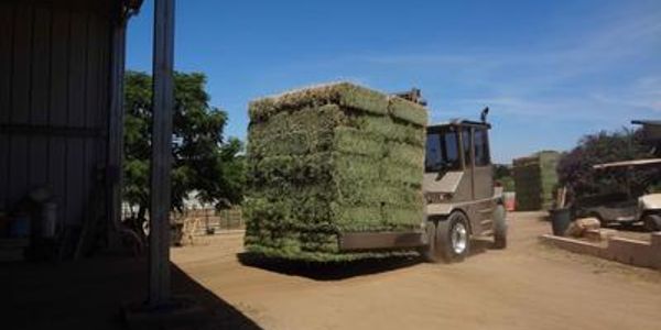 A load of 27 tons of top quality 3rd. cut alfalfa hay being delivered and expertly stored in our hay barn using a squeeze. Tom Loogman, owner of TJ Hay in Hemet, is the excellent hay broker and squeeze operator.